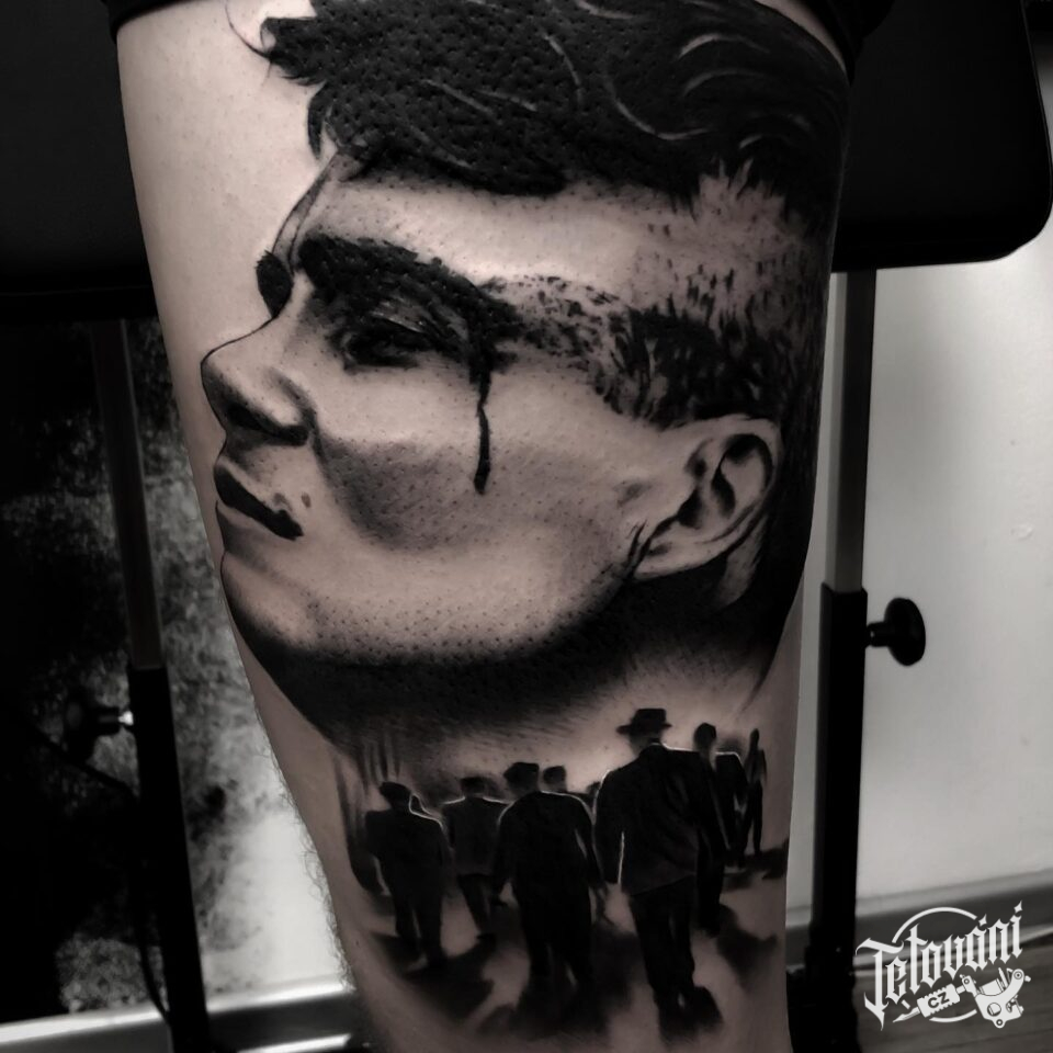 Tetování portrét z filmů a pohádek Peaky Blinders na bok stehna