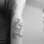 Tetování portrét z květin a nápis na předloktí