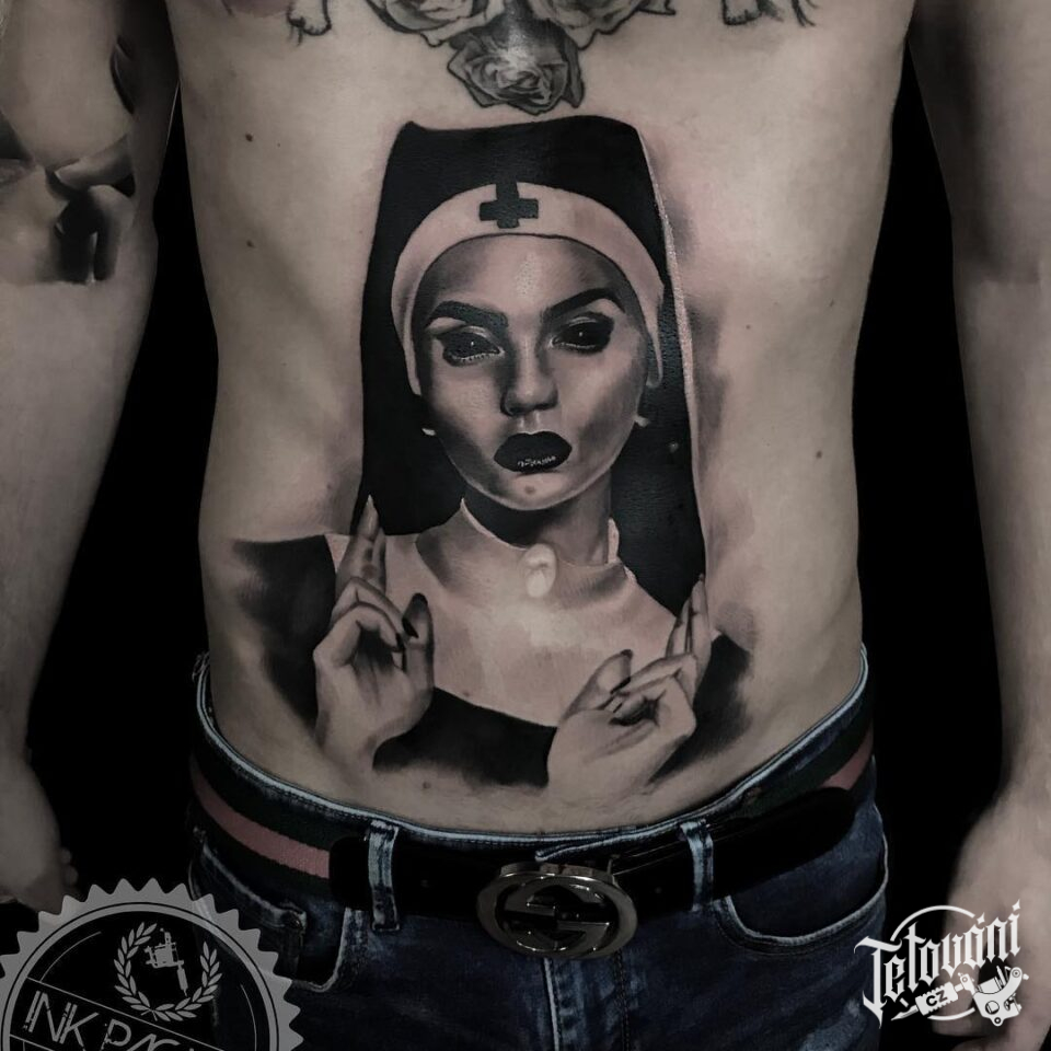 Tetování portrét zdravotní sestry na břichu