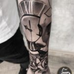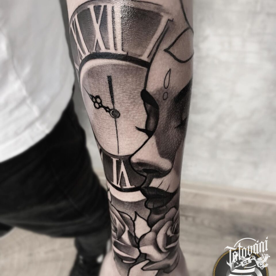Tetování portrét žena, hodiny, růže na předloktí