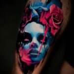 Tetování portrét žena, květiny na stehně