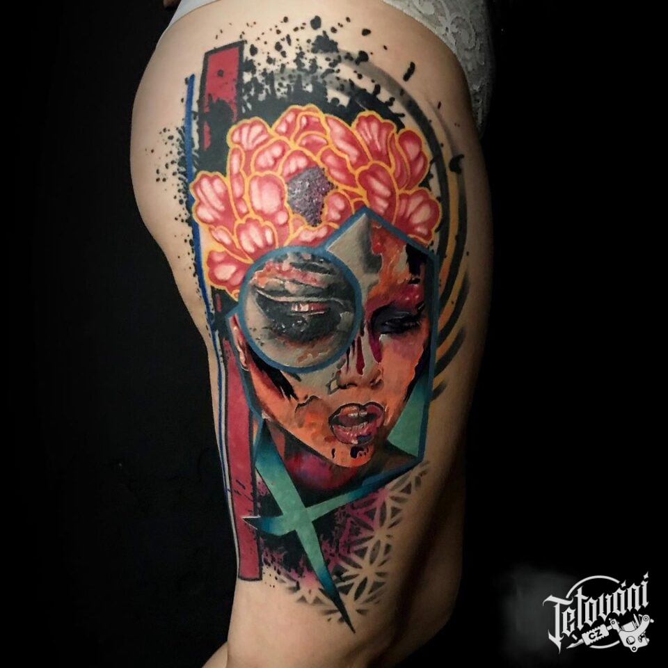 Tetování portrét žena, květiny, tvary na bok stehna
