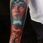 Tetování portrét, žena, měsíc, strom na předloktí