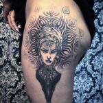 Tetování portrét žena na boku stehna