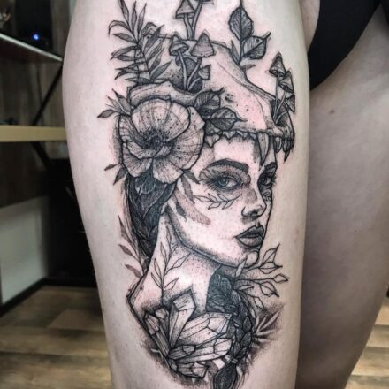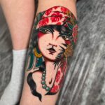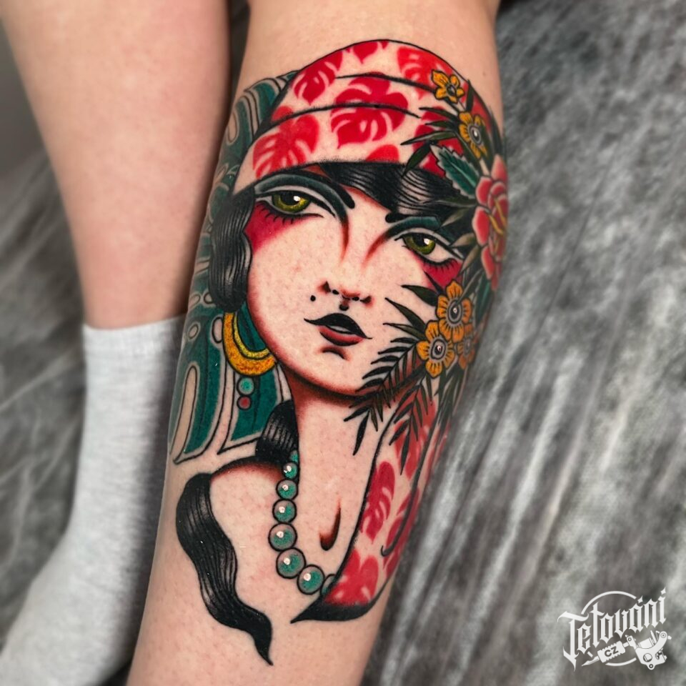 Tetování portrét žena na lýtku
