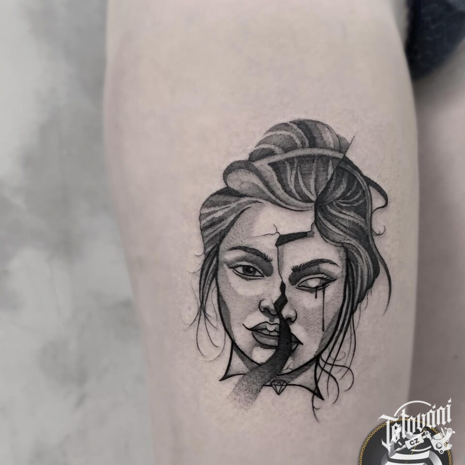 Tetování portrét žena na stehně