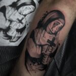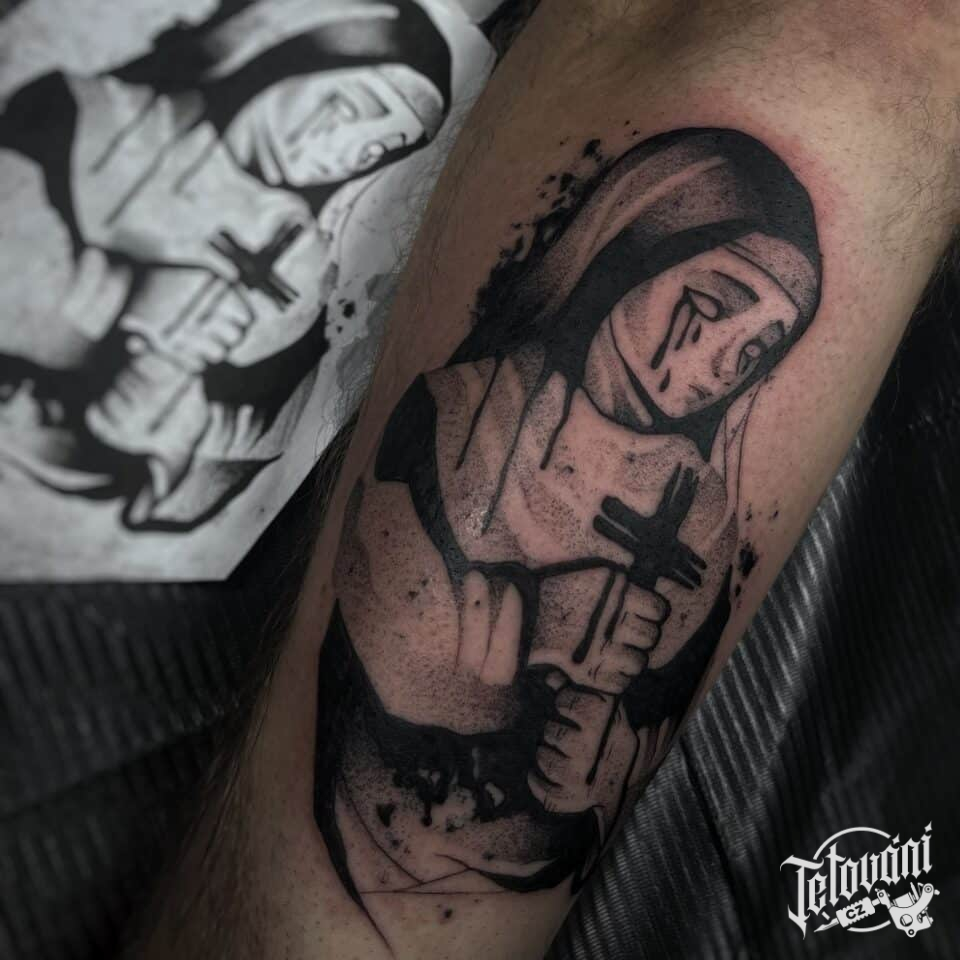 Tetování portrét, žena s křížem, náboženství na holeň