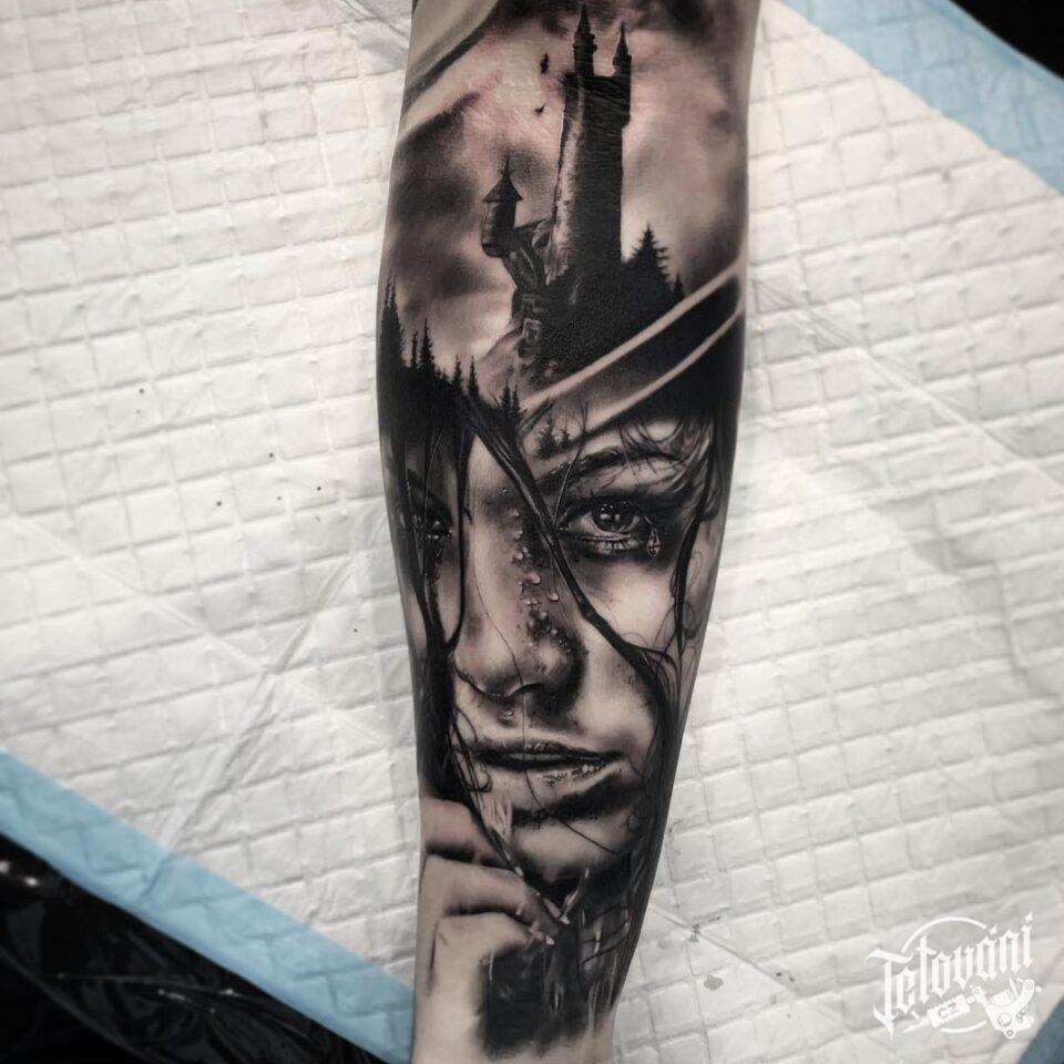 Tetování portrét žena, znaky a symboly na předloktí