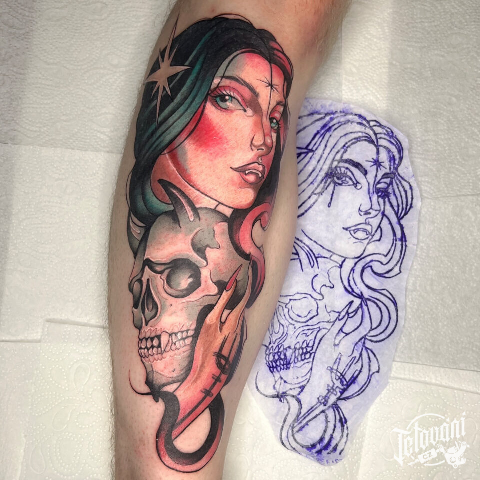 Tetování portrét ženy a lebka na holeň