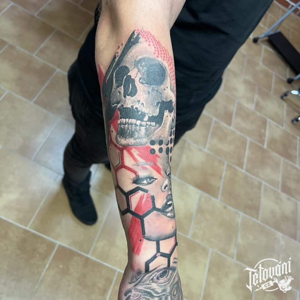 Tetování portrét ženy a lebka na předloktí