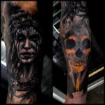 Tetování portrét ženy a lebka na předloktí