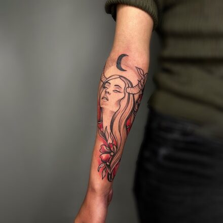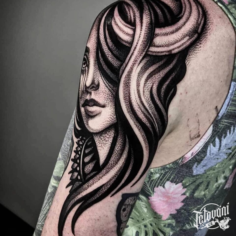 Tetování portrét ženy a mandala na rameni