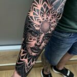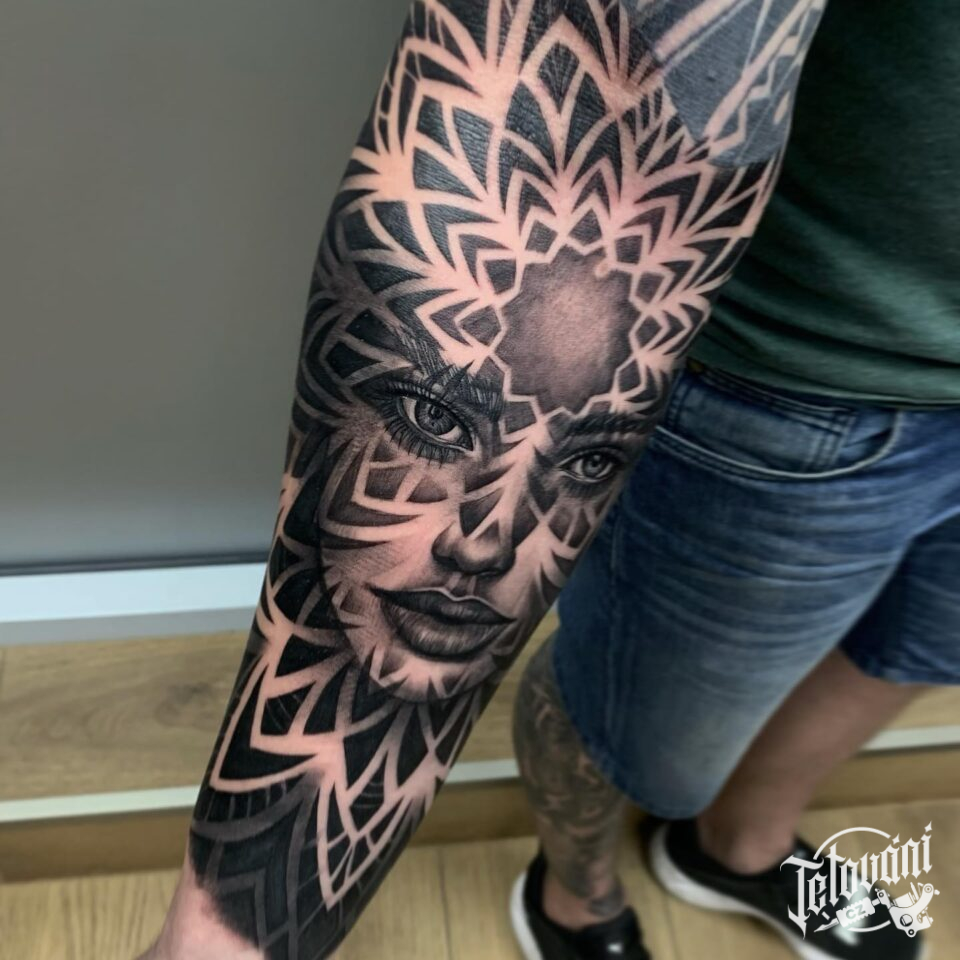 Tetování portrét ženy a mandala na ruce