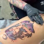Tetování portrét ženy a motýli na stehně