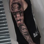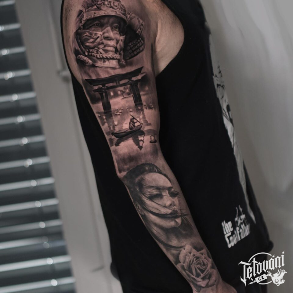 Tetování portrét ženy a může, květina růže, rukáv