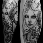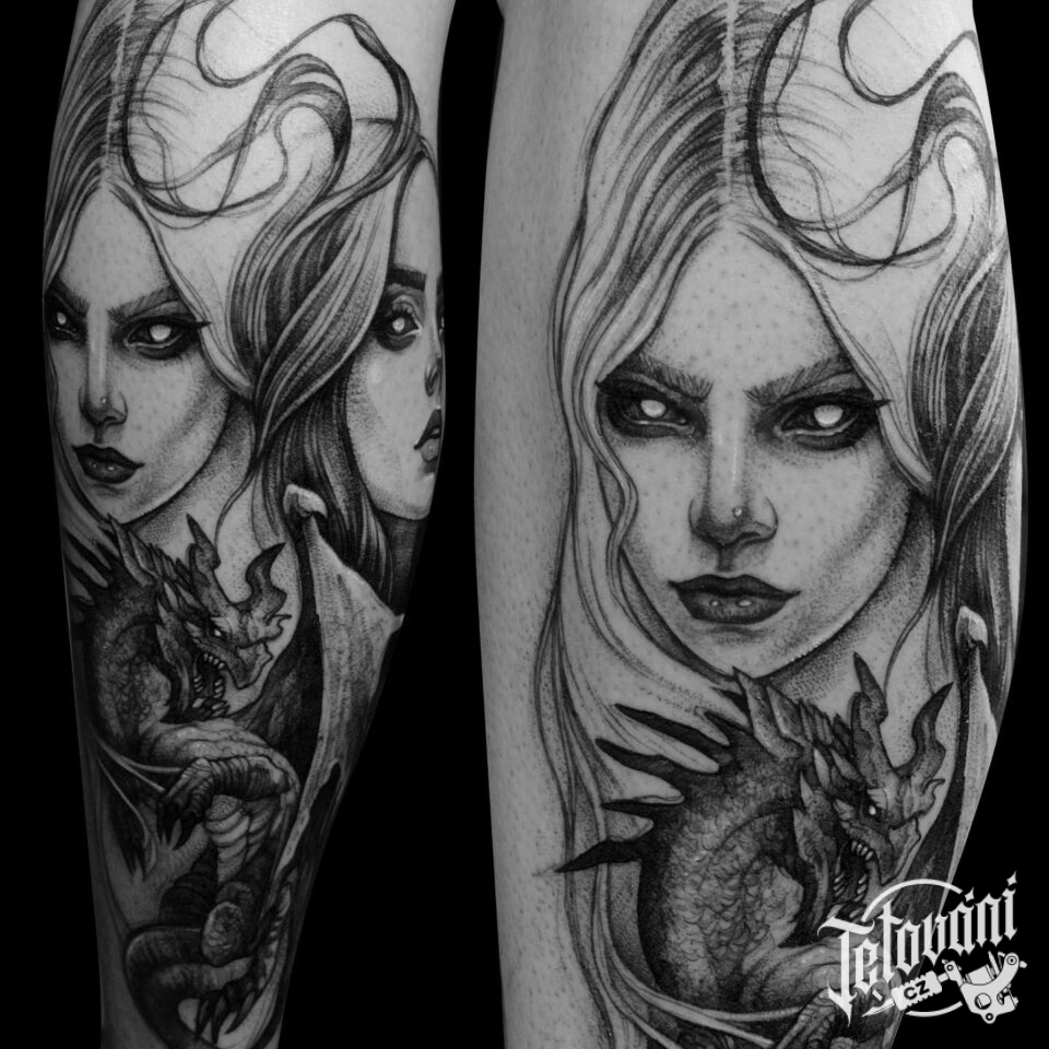 Tetování portrét ženy a mýtická bytost, drak na lýtku