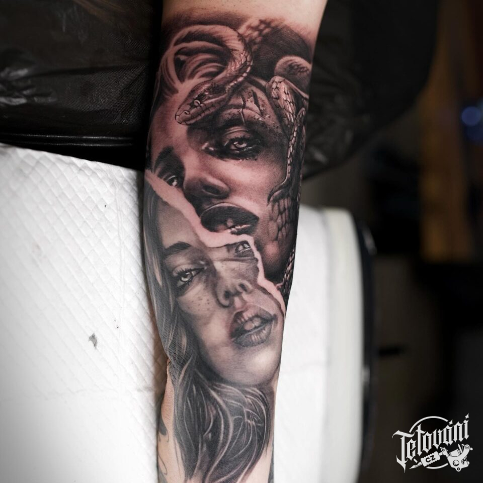 Tetování portrét ženy a mýtické bytosti, mýtická medúza na rukáv