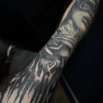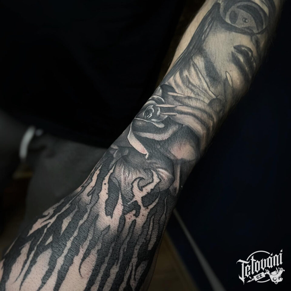 Tetování portrét ženy a nápis na ruku