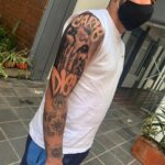 Tetování portrét ženy a nápisy na rameni