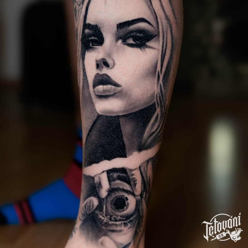Tetování portrét ženy a oko na holeni