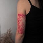 Tetování portrét ženy a ornamenty na paži