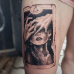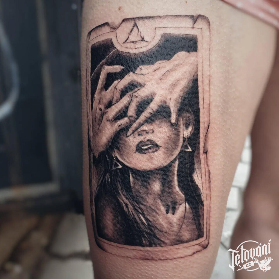 Tetování portrét ženy a ruce na stehně