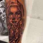 Tetování portrét ženy a růženec na lýtku