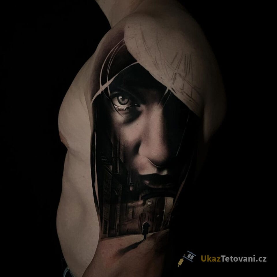 Tetování portrét ženy a ulice na rameno