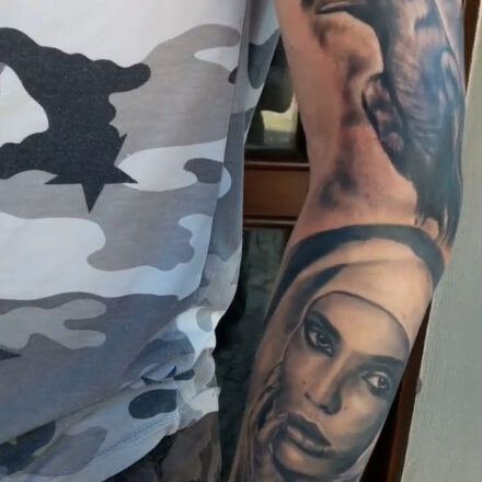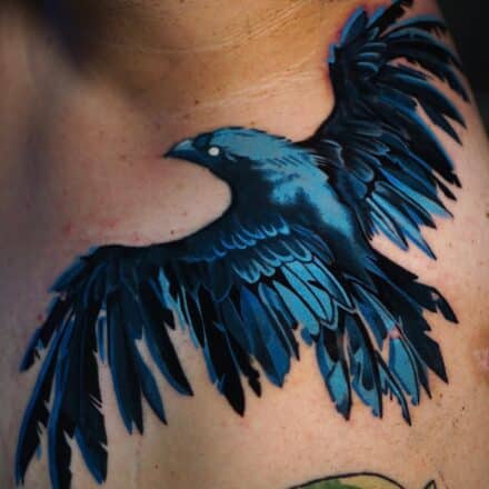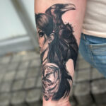 Tetování portrét ženy a zvířata, ptáci, havran na předloktí