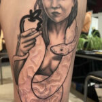 Tetování portrét ženy a zvíře, had na stehno