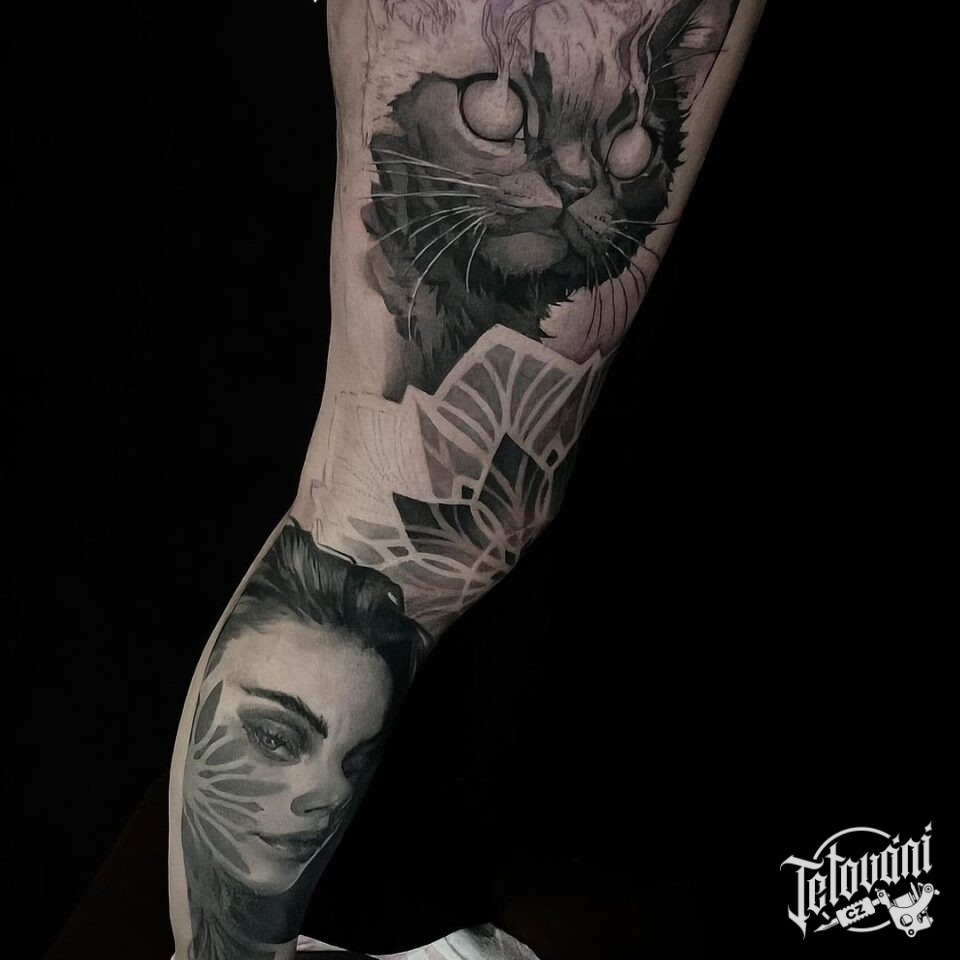 Tetování portrét ženy a zvíře kočka, mandaly na nohu