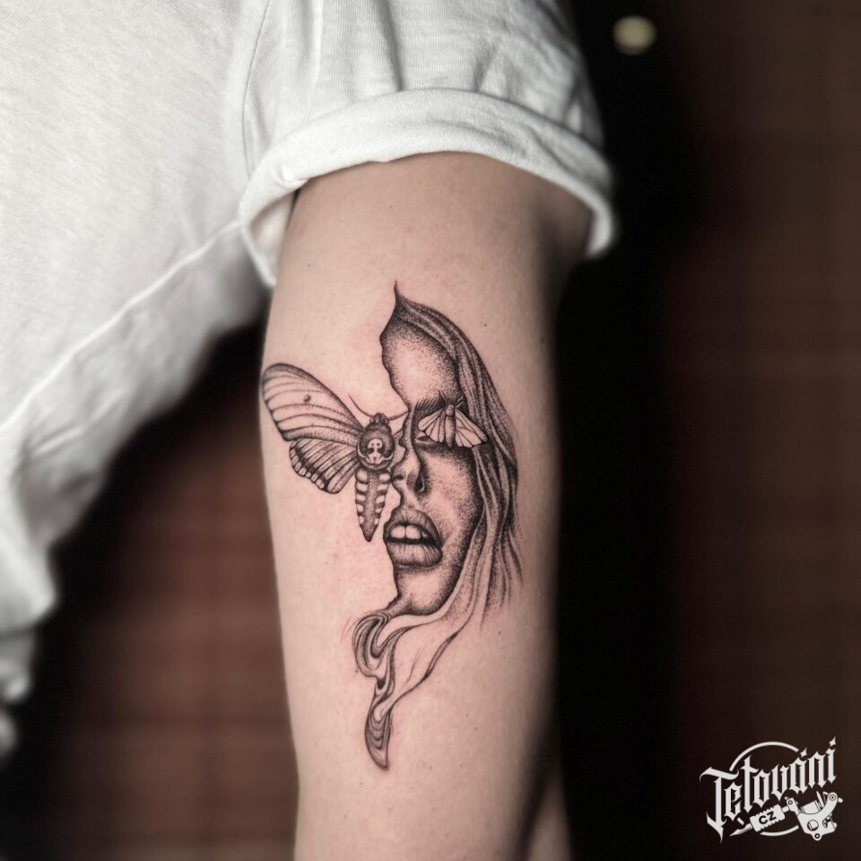 Tetování portrét ženy a zvíře, lišaj smrtihlav na paži