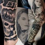 Tetování portrét ženy, andělé, lebka, nápisy na noze