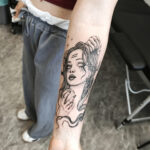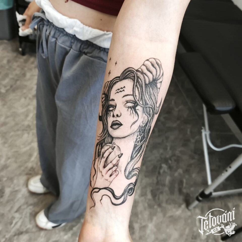 Tetování portrét ženy beranky, vodnář znamení zvěrokruhu na předloktí