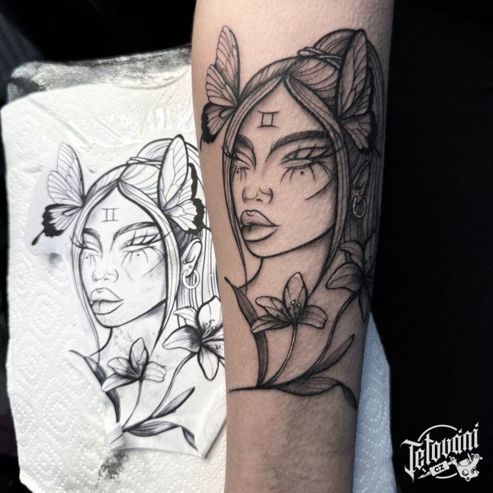 Tetování portrét ženy, Blíženci znamení zvěrokruhu na předloktí