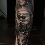 Tetování portrét ženy, bojovnice, lebka zvířete na lýtko