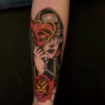 Tetování portrét ženy ďábel, ruka a růže na předloktí