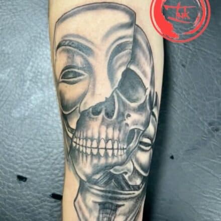 Tetování portrét ženy, divadelní maska, kapesní hodiny a růže na paži