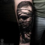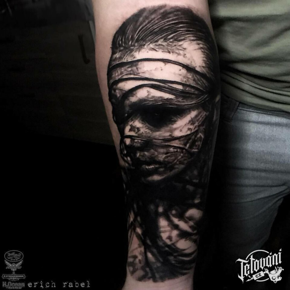 Tetování portrét ženy, drát na předloktí
