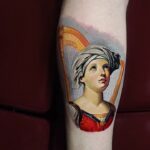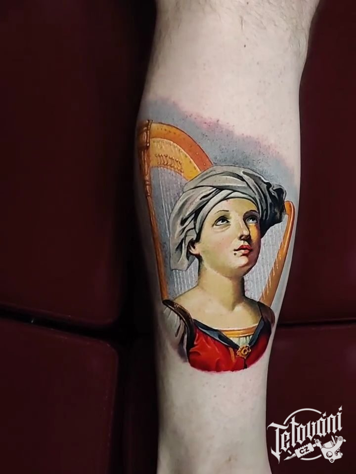 Tetování portrét ženy, harfa na lýtku
