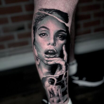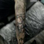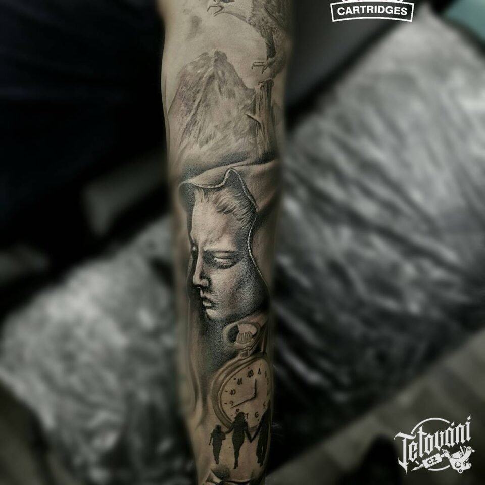 Tetování portrét ženy, hodiny, rodina, rukáv