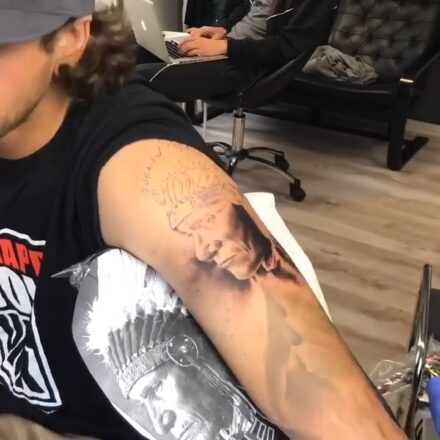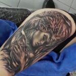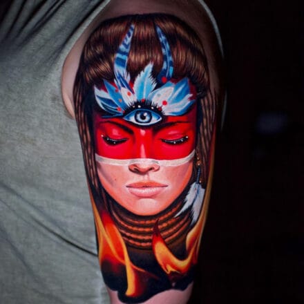 Tetování portrét ženy, indiánka, znaky a symboly a orel na stehnu