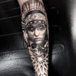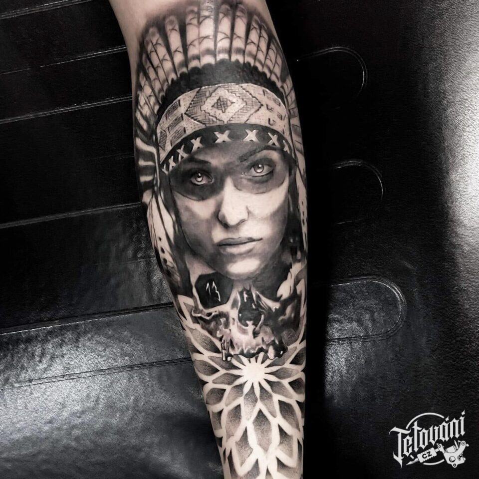 Tetování portrét ženy indiánky, mandaly na lýtko