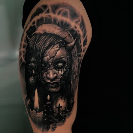 Tetování portrét ženy jako ďábel na rameno
