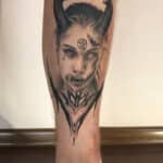 Tetování portrét ženy jako ďábel, znaky a symboly na lýtko