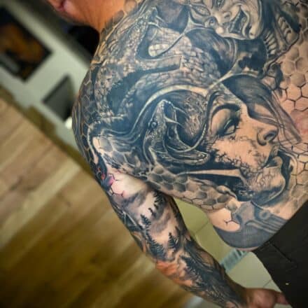 Tetování portrét ženy jako lebka s hadem a okem na stehno