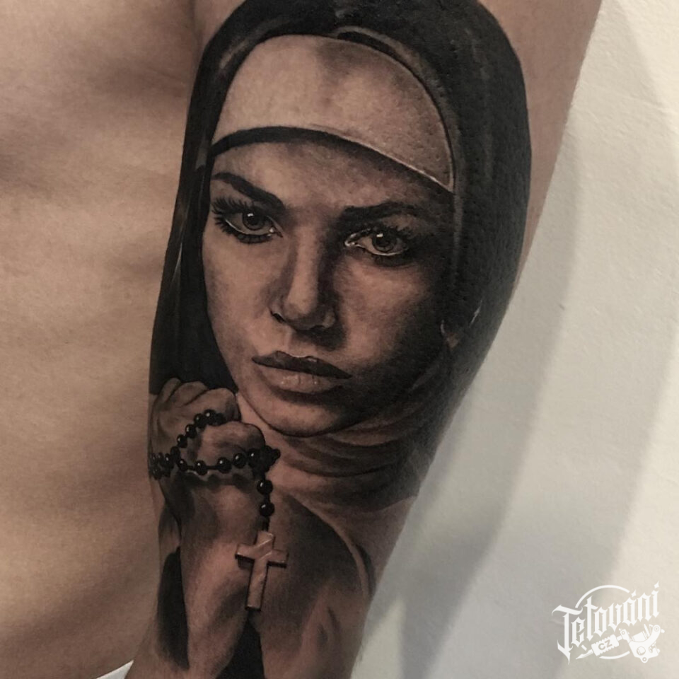 Tetování portrét ženy, jeptiška s růžencem na ruce