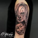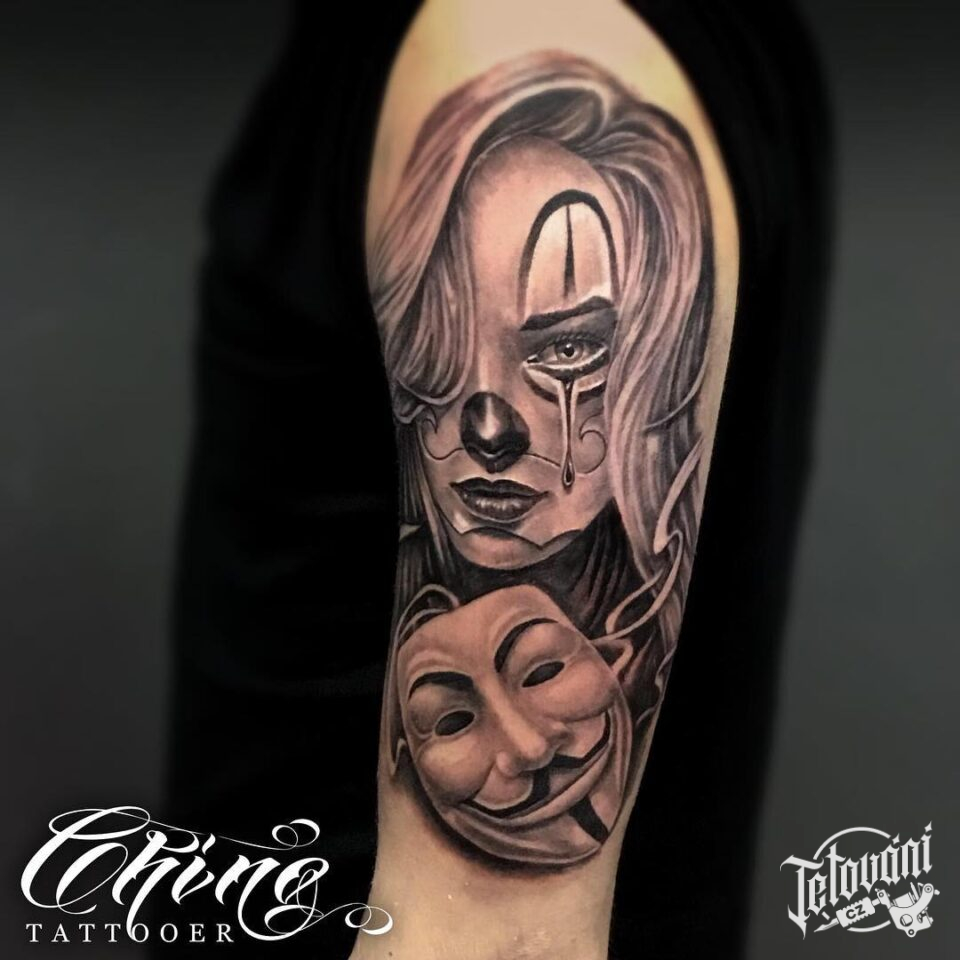 Tetování portrét ženy klauna a maska na rameno