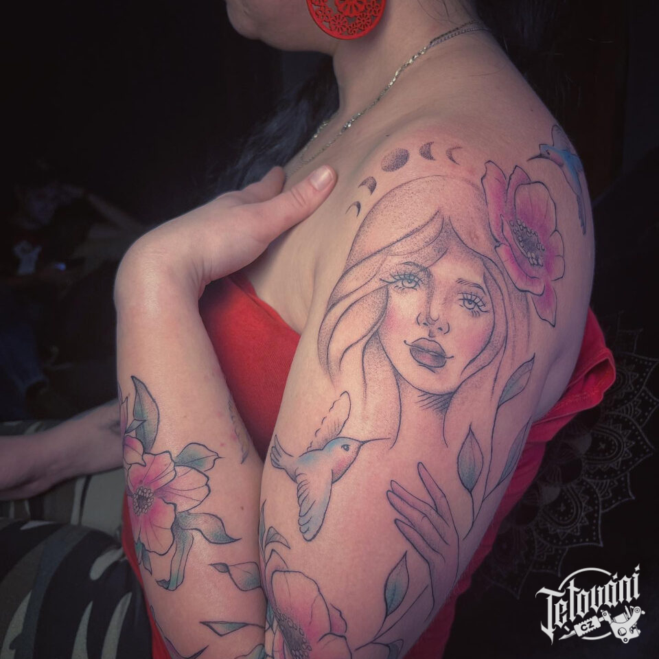 Tetování portrét ženy kolibříkem a květinami, rukáv