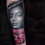 Tetování portrét ženy, květina a nápis na předloktí